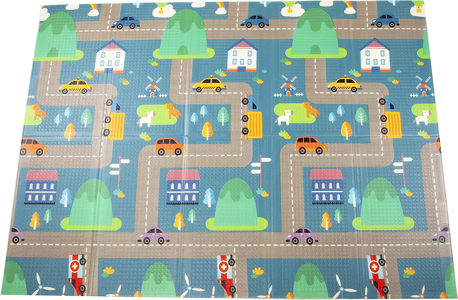• Double-sided design. Comes with two versions: Animals+Letters and Owls+Cities. Bright color and teaches basic recognition. Full dimensions: 58-inch x 77-inch, 0. 33-inch thick. Folding dimensions: 15. 4-inch x 28. 9-inch, 3. 74-inch thick