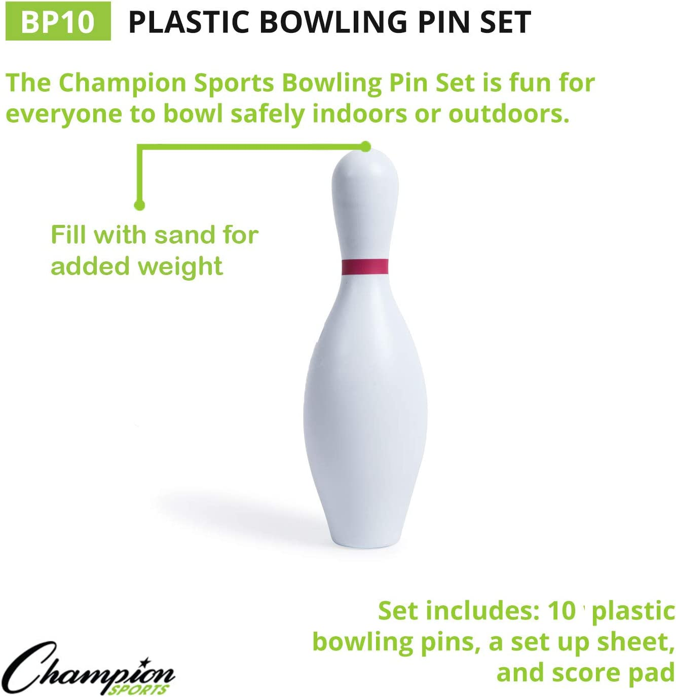• 10 PIN BOWLING - Champion Sports Plastic Bowling Pin set features ten white pins, the number used by the pros; buy bowling pins and balls for school physical education classes or the recreation room