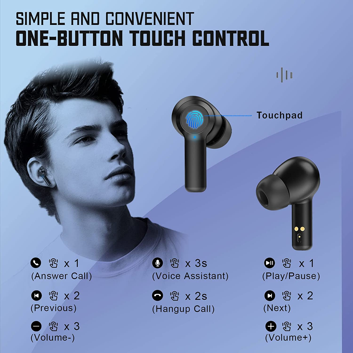All-day Long Playing: With large capacity battery and lower power consumption chip, the Bluetooth wireless ear buds can play about 6H (medium volume) per charge and with charging case, it can play up to 24H totally (the charging case can charge up the earbuds about 3 times). Using type-c fast charging, it takes about 1 hour to fully charge. The indicator on charging case will tell the power level clearly.